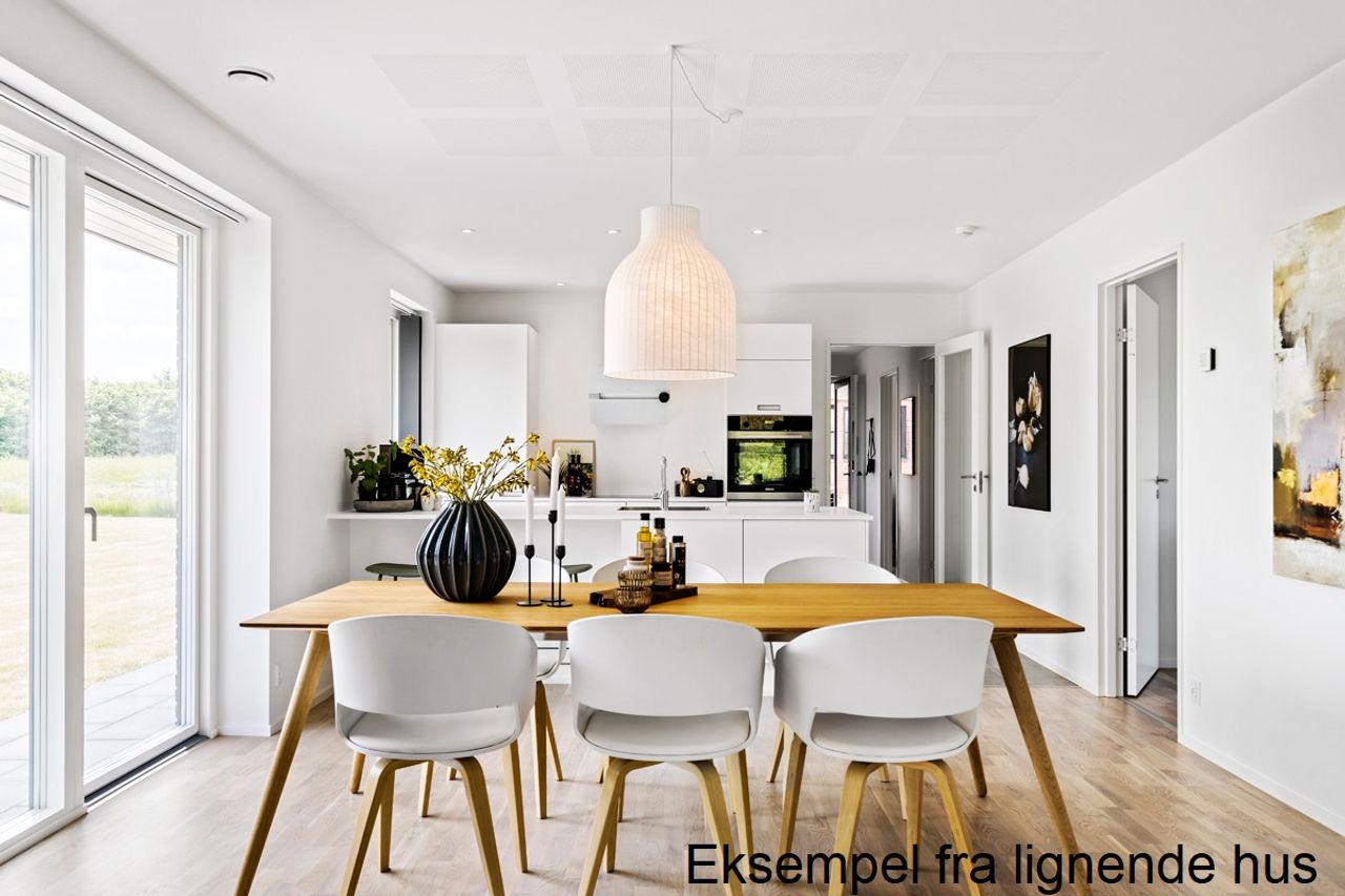 Facaderne udføres i blødstrøgne sten, tagene i sorte betontagsten og vinduerne som 3-lags træ/alu fra Velfac. Indvendigt mødes man af lyse trægulve, gipslofter og en gennemgående modernitet, som skaber et harmonisk og tidløst udtryk. Planløsningen er stort set identisk i de to huse: et stort og åbent køkken/alrum med ovenlys og direkte udgang til terrasse, en sammenhængende opholdsstue med store vinduespartier, fire gode værelser, hvoraf forældreafdelingen har walk-in og eget badeværelse, samt endnu et badeværelse, et rummeligt bryggers og et separat depotrum. Alt er disponeret med fokus på funktionelt flow, gode opbevaringsmuligheder og et naturligt lysindfald.